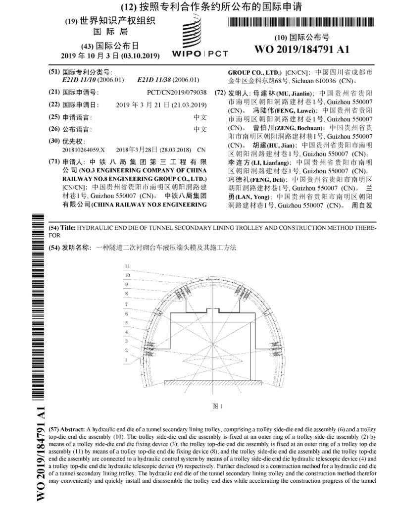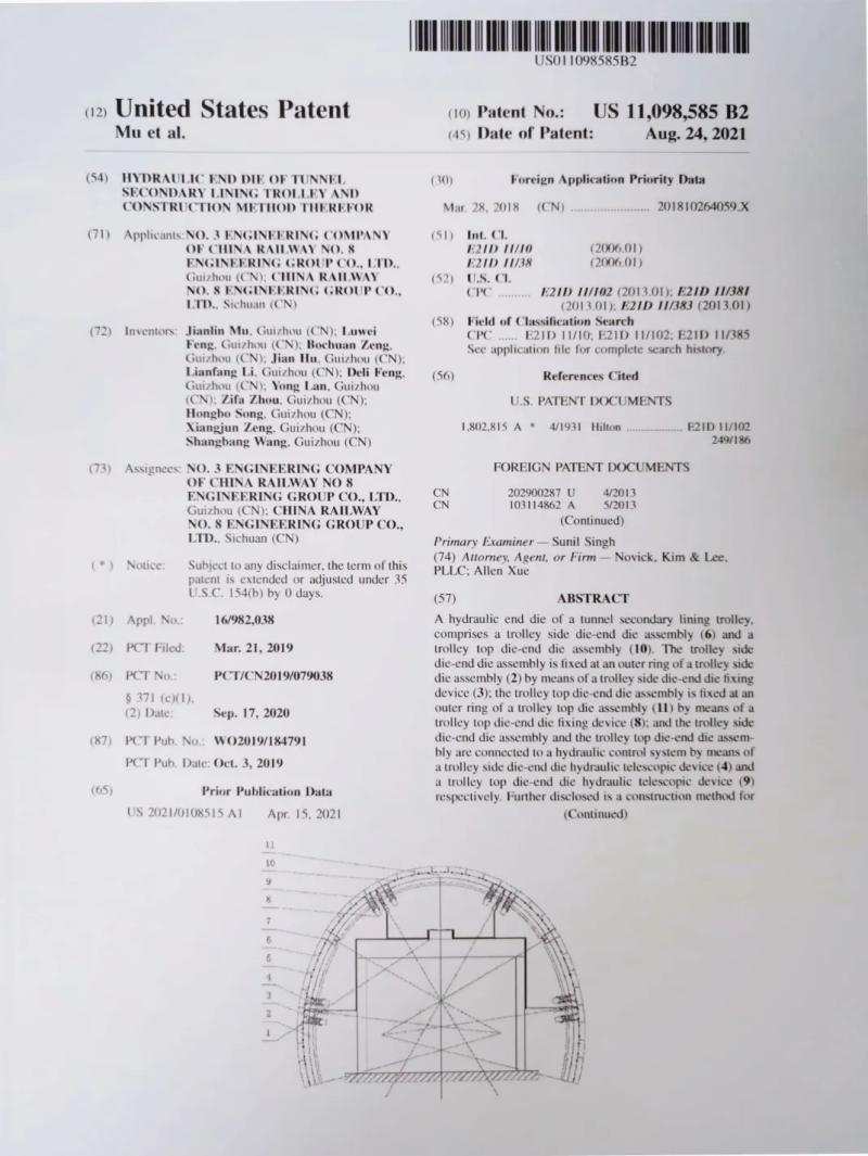 近日,公司收到美国专利商标局颁发的《一种隧道二次衬砌台车液压端头模及其施工方法》发明专利授权证书,这是公司首次通过PCT国际申请获得的专利证书,这在该领域属全国首例,标志着公司在科技创新和国际化自主知识产权方面迈出重大一步。