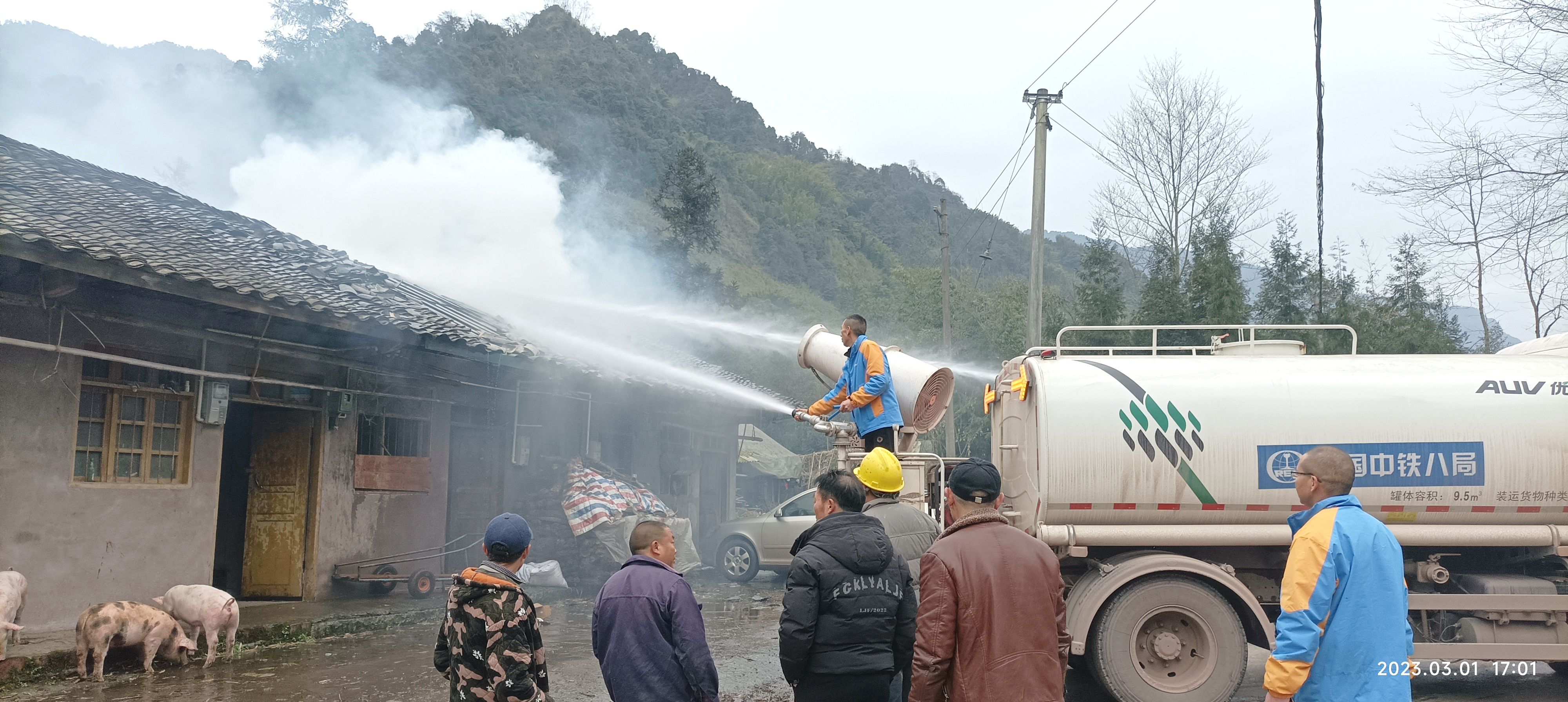3月1日下午4点,雅安市雨城区望鱼镇三台村村委会附近因居民在自家场坝熏制腊肉诱发火灾,物资设备管理中心驻派雅安省道104 项目洒水车队伍接到通知后,火速前往救援。