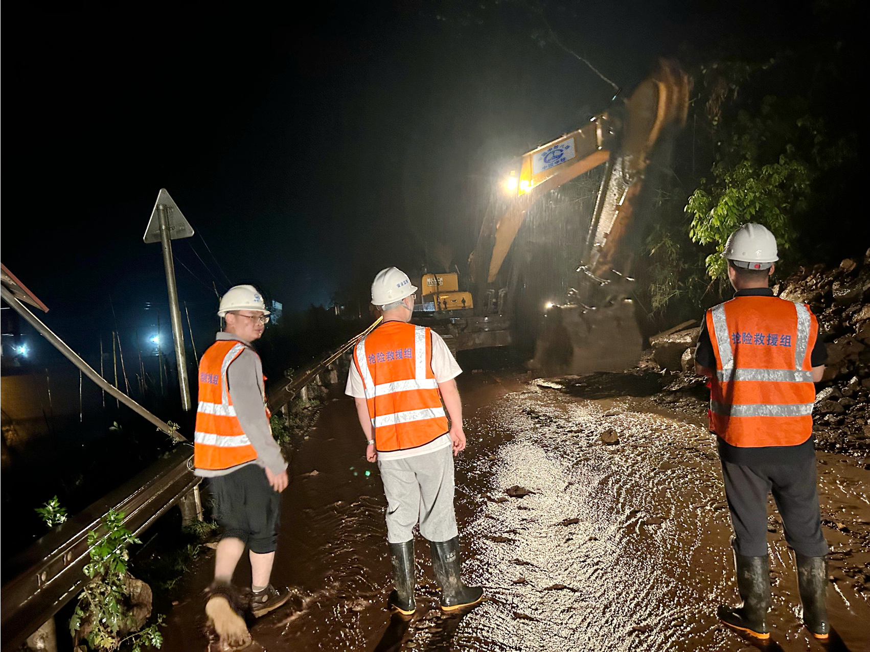 为及时排除险情,雅安省道104项目部立即启动应急预案,迅速组织15名抢险人员和3台抢险机械设备(其中挖掘机2台,装载机1台)赶赴现场。抵达现场后,项目部应急抢险救援队第一时间对雅安省道104线进行初步勘察,发现路面堆满山体滑坡落石、淤泥、树木等障碍物,严重阻碍了车辆的正常通行,同时也给过往车辆和行人带来安全隐患。项目部立即标识出危险区,设置警戒线,安放标识标牌,并对山体塌方路段进行封道,及时排除安全隐患,全力保障山体塌方路段道路交通安全、通畅。