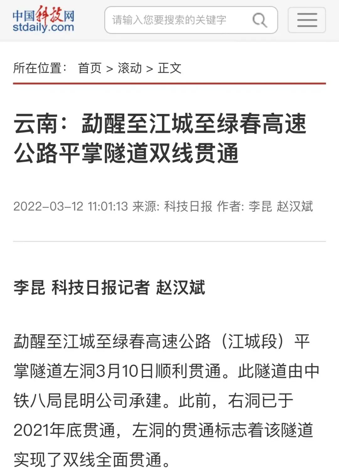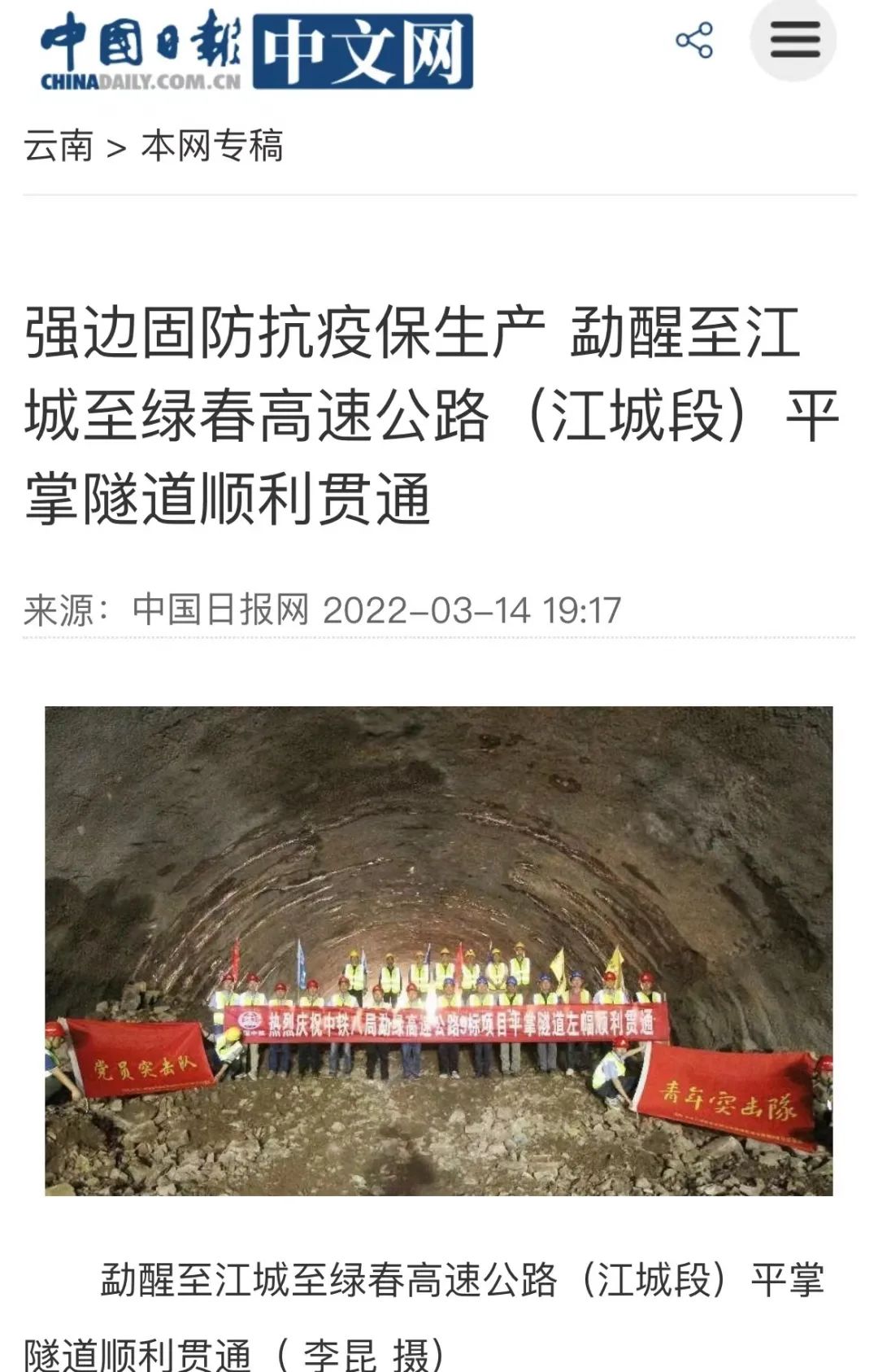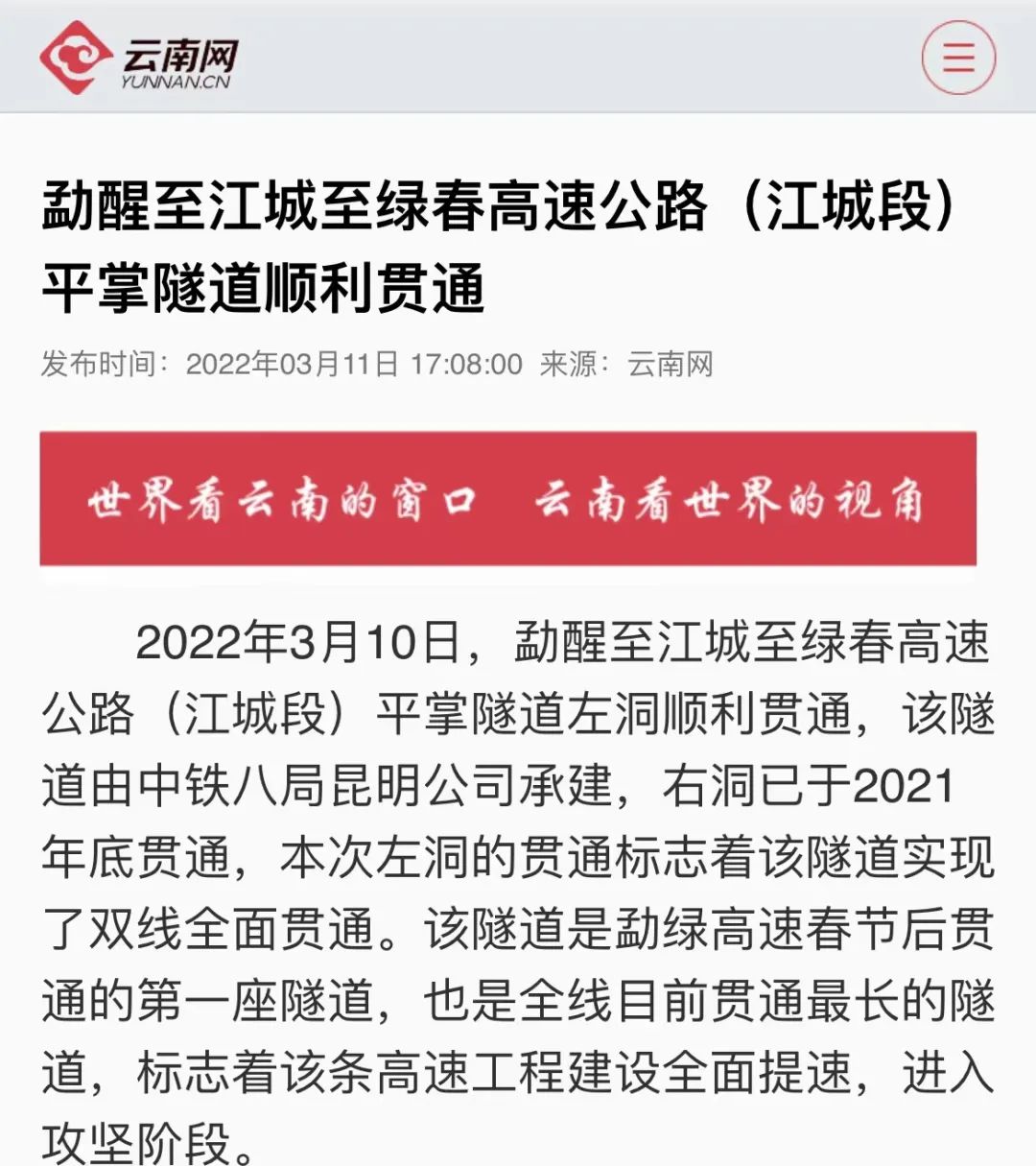 3月10日,由公司承建的勐醒至江城至绿春高速公路(江城段)平掌隧道左洞顺利贯通,至此平掌隧道实现了双线全面贯通,受到多家中央级主流媒体的广泛关注。